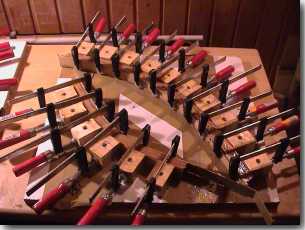 Daran wurden dann 10 Lagen Eichenfurnier à 2,5 mm mit Epoxy zusammengepreßt und lamelliert.