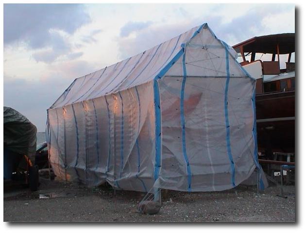 Der erste Winter in Schweden. Der Liegeplatz ist leider nur finanziell günstig. Die Yacht lag auf einem Winterplatz am Hafen in Skanör - direkt an der offenen Küste und Wind und Wetter ausgesetzt. Zum Glück waren die Winterstürme in diesem Winter recht gemäßigt. Das Bootszelt habe ich aber erst im März aufgebaut. Und wenige Tage nachdem es aufgebaut war habe ich wegen einem Sturm die Plane lieber wieder runtergenommen.